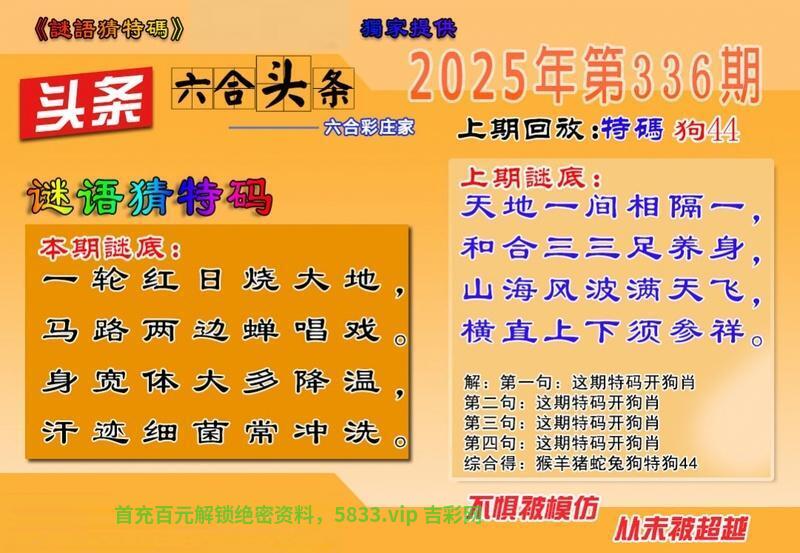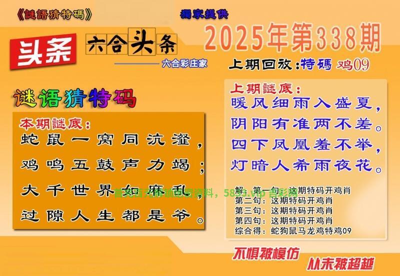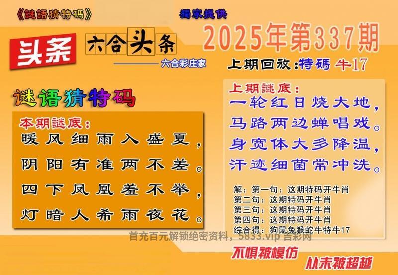 | 337期 暖风细雨入盛夏 阴阳有准两不差 四下凤凰羞不举 灯暗人希雨夜花 解译:暖风细雨入盛夏指风肖兔虎龙,灯暗人希雨夜花指夜肖猪狗鸡虎牛鼠 九肖:兔龙猪狗鸡虎牛鼠羊 六肖:兔龙猪狗鸡虎 特码:15.27.02.26.19.43.20.44.09.33.04.40 |